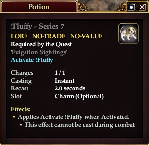 !Fluffy - Series 7 76,463 pages on this wiki Edit Edit source History Talk 0 In-Game Examine Window !Fluffy - Series 7 other resources EQ2U · LootDB · EQ2LL · ZAM · Census xml !Fluffy - Series 7 LORE NO-TRADE NO-VALUE Required by the Quest ' Fulgation Sightings ' Activate !Fluffy Charges 1/1 Casting Instant Recast 2.0 Slot Charm (Optional) Effects: Applies Activate !Fluffy when Activated. This effect can not be cast during combat