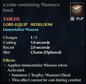 A crate containing Waansu's head 76,461 pages on this wiki Edit Edit source History Talk 0 In-Game Examine Window A crate containing Waansu's head other resources EQ2U · LootDB · EQ2LL · ZAM · Census xml A crate containing Waansu's head FABLED LORE-EQUIP HEIRLOOM Immortalize Waansu Charges 1/1 Casting 5.0 seconds Recast 2.0 seconds Slot Charm (Optional) Effects: Applies Immortalize Waansu when Activated. Summon 1 Trophy: Waansu's Head This effect cannot be cast during combat.