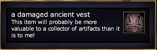 A damaged ancient vest 76,461 pages on this wiki Edit Edit source History Talk 0 In-Game Examine Window A damaged ancient vest other resources EQ2U · LootDB · EQ2LL · ZAM · Census xml EverQuest II Item Information A damaged ancient vest This item will probably be more valuable to a collector of artifacts than it is to me! Obtain: Possible reward from Scrying What does this information mean? Categories : Items Articles missing itemlink Empty Item pages with existing default images Item pages with existing default images Scried Items Add category Cancel Save