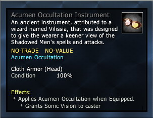 Acumen Occultation Instrument 76,463 pages on this wiki Edit Edit source History Talk 0 In-Game Examine Window Acumen Occultation Instrument other resources EQ2U · LootDB · EQ2LL · ZAM · Census xml Acumen Occultation Instrument An ancient instrument, attributed to a wizard named Vilissia, that was designed to give the wearer a keener view of the Shadowed Men's spells and attacks. LORE NO-TRADE NO-VALUE Acumen Occultation Cloth Armor ( Head ) Effects: Applies Acumen Occultation when Equipped. Grants Acumen Occultation to caster