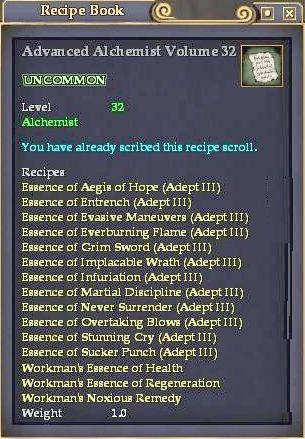 Advanced Alchemist Volume 32 76,461 pages on this wiki Edit Edit source History Talk 0 In-Game Examine Window Advanced Alchemist Volume 32 other resources LootDB · EQ2LL · ZAM · EQ2U · Census xml EverQuest II Recipe Book Information Advanced Alchemist Volume 32 UNCOMMON Level 32 Alchemist Recipes Essence of Aegis of Hope (Adept III) Essence of Entrench (Adept III) Essence of Evasive Maneuvers (Adept III) Essence of Everburning Flame (Adept III) Essence of Grim Sword (Adept III) Essence of Implacable Wrath (Adept III) Essence of Infuriation (Adept III) Essence of Martial Discipline (Adept III) Essence of Never Surrender (Adept III) Essence of Overtaking Blows (Adept III) Essence of Stunning Cry (Adept III) Essence of Sucker Punch (Adept III) Workman's Essence of Health Workman's Essence of Regeneration Workman's Noxious Remedy Obtain: From the Small Chest of mobs. level 32 Link: What does this information mean? Categories : Recipe Books Alchemist Recipe Books Uncommon Recipe Books Articles with spell redlinks Add category Cancel Save