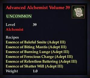 Advanced Alchemist Volume 39 76,461 pages on this wiki Edit Edit source History Talk 0 In-Game Examine Window Advanced Alchemist Volume 39 other resources LootDB · EQ2LL · ZAM · EQ2U · Census xml EverQuest II Recipe Book Information Advanced Alchemist Volume 39 UNCOMMON Level 39 Alchemist Recipes Essence of Baleful Smite (Adept III) Essence of Biting Mantis (Adept III) Essence of Burning Lunge (Adept III) Essence of Ferocious Charge (Adept III) Essence of Relentless Battering (Adept III) Essence of Shatter Will (Adept III) Obtain: Found in Chests of mobs L39 Link: What does this information mean? Categories : Recipe Books Alchemist Recipe Books Uncommon Recipe Books Articles with spell redlinks Add category Cancel Save