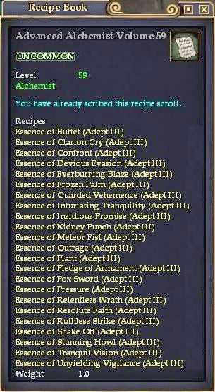 Advanced Alchemist Volume 59 76,461 pages on this wiki Edit Edit source History Talk 0 In-Game Examine Window Advanced Alchemist Volume 59 other resources LootDB · EQ2LL · ZAM · EQ2U · Census xml EverQuest II Recipe Book Information Advanced Alchemist Volume 59 UNCOMMON Level 59 Alchemist Recipes Essence of Buffet (Journeyman) Essence of Clarion Cry (Journeyman) Essence of Confront (Journeyman) Essence of Devious Evasion IV (Journeyman) Essence of Everburning Blaze (Journeyman) Essence of Frozen Palm V (Journeyman) Essence of Guarded Vehemence (Journeyman) Essence of Infuriating Tranquility (Journeyman) Essence of Insidious Promise (Journeyman) Essence of Kidney Punch (Journeyman) Essence of Meteor Fist V (Journeyman) Essence of Outrage (Journeyman) Essence of Plant III (Journeyman) Essence of Pledge of Armament IV (Journeyman) Essence of Pox Sword (Journeyman) Essence of Pressure (Journeyman) Essence of Relentless Wrath (Journeyman) Essence of Resolute Faith IV (Journeyman) Essence of Ruthless Strike (Journeyman) Essence of Shake Off (Journeyman) Essence of Stunning Howl (Journeyman) Essence of Tranquil Vision IV (Journeyman) Essence of Unyielding Vigilance (Journeyman) Obtain: From the Small Chest of L59 mobs. Link: \aITEM -978424307 -1729666350:Advanced Alchemist Volume 59\/a \aITEM -978424307 -1729666350:Advanced Alchemist Volume 59\/a What does this information mean? Categories : Recipe Books Alchemist Recipe Books Uncommon Recipe Books Articles with spell redlinks Add category Cancel Save