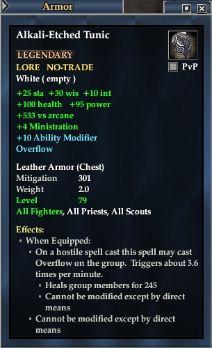 Alkali-Etched Tunic 76,461 pages on this wiki Edit Edit source History Talk 0 In-Game Examine Window Alkali-Etched Tunic other resources EQ2U · LootDB · EQ2LL · ZAM · Census xml Alkali-Etched Tunic LEGENDARY LORE NO-TRADE +30 wis +10 int +25 sta +533 vs arcane +4 Ministration +10 Ability Modifier Overflow Leather Armor ( Chest ) Mitigation 301 Level 79 ( Tier 8 ) All Fighters , All Priests , All Scouts Effects: When Equipped: On a hostile spell cast this spell may cast Overflow on the group. Triggers about 2.0 times per minute. Heals group members for 846 Cannot be modified except by direct means