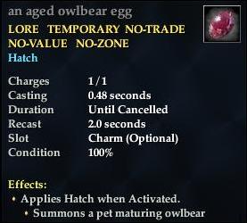 An aged owlbear egg 76,463 pages on this wiki Edit Edit source History Talk 0 In-Game Examine Window An aged owlbear egg other resources EQ2U · LootDB · EQ2LL · ZAM · Census xml An aged owlbear egg LORE TEMPORARY NO-TRADE NO-ZONE NO-VALUE Hatch Charges 1/1 Casting 0.5 seconds Duration Until Cancelled Recast 2.0 seconds Slot Charm (Optional) Effects: Applies Hatch when Activated. Summons a pet maturing owlbear