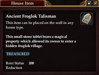 Ancient Froglok Talisman 76,463 pages on this wiki Edit Edit source History Talk 0 In-Game Examine Window Ancient Froglok Talisman other resources EQ2U · LootDB · EQ2LL · ZAM · Census xml EverQuest II Item Information Type : House Item Subtype : World Event Reward Ancient Froglok Talisman The small stone tablet bears a magical property which allowed its owner to enter a hidden froglok village. TREASURED LORE NO-TRADE Rent Status Reduction 200 Obtain: Reward from the quest " Uncovering the Froglok Secret ." What does this information mean? Categories : Items House Item (Item Type) World Event Reward (Item Subtype) Treasured Items Items with Rent Status Reduction Tier 3 RSR Items Articles missing itemlink Item pages with existing default images Teleport (Item Subtype) Add category Cancel Save