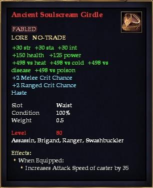 Ancient Soulscream Girdle 76,461 pages on this wiki Edit Edit source History Talk 0 In-Game Examine Window Ancient Soulscream Girdle other resources EQ2U · LootDB · EQ2LL · ZAM · Census xml Ancient Soulscream Girdle FABLED ATTUNEABLE HEIRLOOM +45 wis +49 int +48 sta +5 Focus 7% Crit Chance 2.1% Crit Bonus 2.8% Potency Haste Slot Waist Level 80 ( Tier 9 ) Effects: When Equipped: Increases Attack Speed of caster by 35