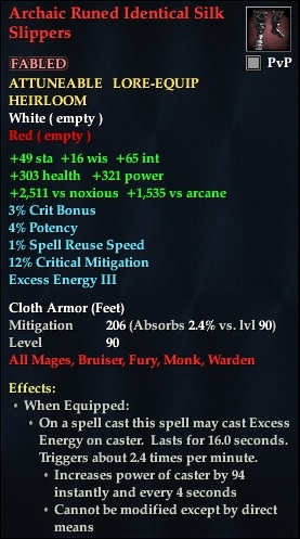 Archaic Runed Identical Silk Slippers 76,461 pages on this wiki Edit Edit source History Talk 0 In-Game Examine Window Archaic Runed Identical Silk Slippers other resources EQ2U · LootDB · EQ2LL · ZAM · Census xml Archaic Runed Identical Silk Slippers FABLED ATTUNABLE LORE-EQUIP HEIRLOOM +16 wis +65 int +49 sta +2,511 vs noxious +1,535 vs arcane 3% Crit Bonus 4% Potency 1% Spell Reuse Speed Excess Energy III Cloth Armor ( Feet ) Mitigation 206 Level 90 ( Tier 10 ) All Mages , Bruiser , Monk , Fury , Warden Effects: When Equipped: On a spell cast this spell may cast Excess Energy on caster. Lasts for 16.0 seconds. Triggers about 2.0 times per minute. Increases power of caster by 94 instantly and every 4 seconds Cannot be modified except by direct means