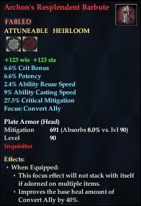 Archon's Resplendent Barbute 76,461 pages on this wiki Edit Edit source History Talk 0 In-Game Examine Window Archon's Resplendent Barbute other resources EQ2U · LootDB · EQ2LL · ZAM · Census xml Archon's Resplendent Barbute FABLED ATTUNEABLE HEIRLOOM +123 wis +123 sta 6.6% Crit Bonus 6.6% Potency 2.4% Ability Reuse Speed 9% Ability Casting Speed Focus : Convert Ally Plate Armor ( Head ) Mitigation 691 Level 90 ( Tier 10 ) Inquisitor Effects: When Equipped: Improves the base heal amount of Convert Ally by 40%. This focus effect will not stack with itself if adorned on multiple items.