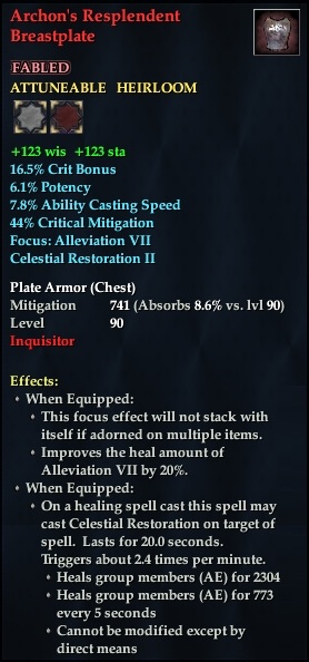 Archon's Resplendent Breastplate 76,461 pages on this wiki Edit Edit source History Talk 0 In-Game Examine Window Archon's Resplendent Breastplate other resources EQ2U · LootDB · EQ2LL · ZAM · Census xml Archon's Resplendent Breastplate FABLED ATTUNEABLE HEIRLOOM +123 wis +123 sta 16.5% Crit Bonus 6.1% Potency 7.8% Ability Casting Speed Focus : Alleviation VII Celestial Restoration II Plate Armor ( Chest ) Mitigation 741 Level 90 ( Tier 10 ) Inquisitor Effects: When Equipped: Improves the heal amount of Alleviation VII by 20%. This focus effect will not stack with itself if adorned on multiple items. When Equipped: On a healing spell cast this spell may cast Celestial Restoration on target of spell. Lasts for 20.0 seconds. Triggers about 2.4 times per minute. Heals group members (AE) for 2304 Heals group members (AE) for 773 every 5 seconds Cannot be modified except by direct means. Must not be engaged in pvp combat This item may not be used in a PvP zone.