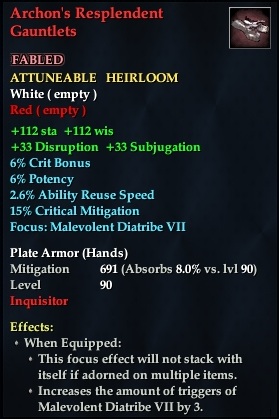 Archon's Resplendent Gauntlets 76,461 pages on this wiki Edit Edit source History Talk 0 In-Game Examine Window Archon's Resplendent Gauntlets other resources EQ2U · LootDB · EQ2LL · ZAM · Census xml Archon's Resplendent Gauntlets FABLED ATTUNEABLE HEIRLOOM +123 wis +123 sta +33 Disruption +33 Subjugation 6.6% Crit Bonus 6.6% Potency 2.8% Ability Reuse Speed Focus : Malevolent Diatribe VII Plate Armor ( Hands ) Mitigation 691 Level 90 ( Tier 10 ) Inquisitor Effects: When Equipped: This focus effect will not stack with itself if adorned on multiple items Increases the amount of triggers of Malevolent Diatribe VII by 3