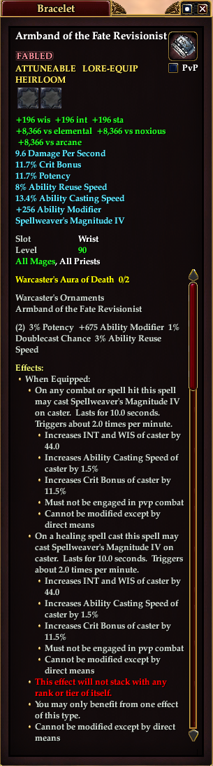 Armband of the Fate Revisionist 76,461 pages on this wiki Edit Edit source History Talk 0 In-Game Examine Window Armband of the Fate Revisionist other resources EQ2U · LootDB · EQ2LL · ZAM · Census xml Armband of the Fate Revisionist FABLED ATTUNEABLE LORE-EQUIP HEIRLOOM +196 wis +196 int +196 sta +8,366 vs elemental +8,366 vs noxious +8,366 vs arcane 9.6 Damage Per Second 11.7% Crit Bonus 11.7% Potency 8% Ability Reuse Speed 13.4% Ability Casting Speed +256 Ability Modifier Spellweaver's Magnitude IV Slot Wrist Level 90 ( Tier 10 ) All Mages , All Priests Effects: When Equipped: On a healing spell cast this spell may cast Spellweaver's Magnitude IV on caster. Lasts for 10.0 seconds. Triggers about 2.0 times per minute. Increases WIS and INT of caster by 44.0 Increases Ability Casting Speed of caster by 1.5% Increases Crit Bonus of caster by 11.5% Must not be engaged in pvp combat Cannot be modified except by direct means This effect will not stack with any rank or tier of itself. On any combat or spell hit this spell may cast Spellweaver's Magnitude IV on caster. Lasts for 10.0 seconds. Triggers about 2.0 times per minute. Increases WIS and INT of caster by 44.0 Increases Ability Casting Speed of caster by 1.5% Increases Crit Bonus of caster by 11.5% Must not be engaged in pvp combat Cannot be modified except by direct means You may only benefit from one effect of this type. Cannot be modified except by direct means