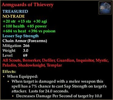 Armguards of Thievery 76,461 pages on this wiki Edit Edit source History Talk 0 In-Game Examine Window Armguards of Thievery other resources EQ2U · LootDB · EQ2LL · ZAM · Census xml Armguards of Thievery TREASURED NO-TRADE +20 str +30 agi +15 sta +684 vs elemental +396 vs noxious Lesser Sap Strength Chain Armor ( Forearms ) Mitigation 266 Level 69 ( Tier 7 ) All Scouts , Berserker , Guardian , Paladin , Shadowknight , Inquisitor , Templar , Defiler , Mystic Effects: When Equipped: When target is damaged with a melee weapon this spell has a 7% chance to cast Sap Strength on target's attacker. Lasts for 24.0 seconds. Decreases Damage Per Second of target by 10.0
