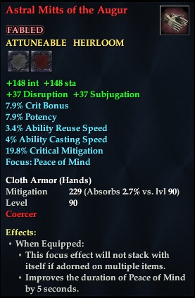 Astral Mitts of the Augur 76,461 pages on this wiki Edit Edit source History Talk 0 In-Game Examine Window Astral Mitts of the Augur other resources EQ2U · LootDB · EQ2LL · ZAM · Census xml Astral Mitts of the Augur FABLED ATTUNEABLE HEIRLOOM +148 int +148 sta +37 Disruption +37 Subjugation 7.9% Crit Bonus 7.9% Potency 3.4% Ability Reuse Speed 4% Ability Casting Speed Focus : Peace of Mind Cloth Armor ( Hands ) Mitigation 229 Level 90 ( Tier 10 ) Coercer Effects: When Equipped: Improves the duration of Peace of Mind by 5 seconds. This focus ability will not stack with itself if adorned on multiple items.