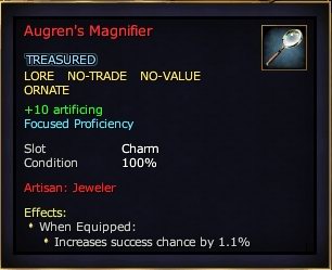 Augren's Magnifier 76,461 pages on this wiki Edit Edit source History Talk 0 In-Game Examine Window Augren's Magnifier other resources EQ2U · LootDB · EQ2LL · ZAM · Census xml Augren's Magnifier TREASURED LORE NO-TRADE NO-VALUE ORNATE +10 Artificing Focused Proficiency Slot Charm Artisan: Jeweler Effects: When Equipped: Increases success chance by 1.1%