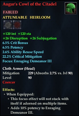 Augur's Cowl of the Citadel 76,461 pages on this wiki Edit Edit source History Talk 0 In-Game Examine Window Augur's Cowl of the Citadel other resources EQ2U · LootDB · EQ2LL · ZAM · Census xml Augur's Cowl of the Citadel FABLED ATTUNEABLE HEIRLOOM +120 int +120 sta +26 Disruption +26 Subjugation 6.5% Crit Bonus 6.5% Potency 2.6% Ability Reuse Speed Focus : Enraging Demeanor III Cloth Armor ( Head ) Mitigation 229 Level 90 ( Tier 10 ) Coercer Effects: When Equipped: This focus effect will not stack with itself if adorned on multiple items. Adds 10% potency to Enraging Demeanor III .