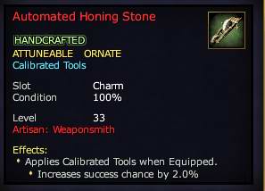Automated Honing Stone 76,461 pages on this wiki Edit Edit source History Talk 0 In-Game Examine Window Automated Honing Stone other resources EQ2U · LootDB · EQ2LL · ZAM · Census xml Automated Honing Stone HANDCRAFTED ATTUNEABLE Calibrated Tools Slot Charm (Optional) Level 40 ( Tier 5 ) Effects: Applies Calibrated Tools when Equipped. Increases success chance by 2.0%