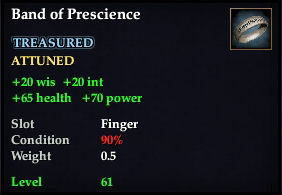 Band of Prescience 76,461 pages on this wiki Edit Edit source History Talk 0 In-Game Examine Window Band of Prescience other resources EQ2U · LootDB · EQ2LL · ZAM · Census xml Band of Prescience TREASURED ATTUNEABLE +20 wis +20 int Slot Finger Level 61 ( Tier 7 ) Obtain: No longer obtainable What does this information mean? Notes Edit The author wishes to credit LootDB . Categories : Equipment Finger (Inventory Slot) Equipment pages with existing default images Treasured Equipment Tier 7 Equipment Fighter Equipment Warrior Equipment Berserker Equipment Guardian Equipment Brawler Equipment Bruiser Equipment Monk Equipment Crusader Equipment Paladin Equipment Shadowknight Equipment Mage Equipment Sorcerer Equipment Warlock Equipment Wizard Equipment Enchanter Equipment Coercer Equipment Illusionist Equipment Summoner Equipment Conjuror Equipment Necromancer Equipment Channeler Equipment Cleric Equipment Inquisitor Equipment Templar Equipment Druid Equipment Fury Equipment Warden Equipment Shaman Equipment Defiler Equipment Mystic Equipment Beastlord Equipment Predator Equipment Assassin Equipment Ranger Equipment Bard Equipment Dirge Equipment Troubador Equipment Rogue Equipment Brigand Equipment Swashbuckler Equipment Articles missing itemlink LootDB Credits Add category Cancel Save