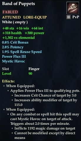 Band of Puppets 76,461 pages on this wiki Edit Edit source History Talk 0 In-Game Examine Window Band of Puppets other resources EQ2U · LootDB · EQ2LL · ZAM · Census xml Band of Puppets FABLED ATTUNEABLE LORE-EQUIP +16 wis +64 int +48 sta +1302 vs elemental 0.8% Crit Bonus 2.8% Potency 1.9% Spell Reuse Speed Power Flux III Mystic Havoc Slot Finger Level 90 ( Tier 10 ) Effects: When Equipped: Applies Power Flux III to qualifying pets. Increases Crit Chance of target by 3.0 Increases ability modifier of target by 115.0 When Equipped: On any combat or spell hit this spell may cast Mystic Havoc on target of attack. Triggers about 2.0 times per minute. Inflicts 1192 magic damage on target Cannot be modified except by direct means