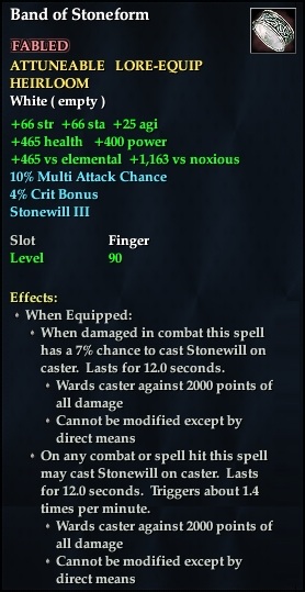 Band of Stoneform 76,461 pages on this wiki Edit Edit source History Talk 0 In-Game Examine Window Band of Stoneform other resources EQ2U · LootDB · EQ2LL · ZAM · Census xml Band of Stoneform FABLED ATTUNEABLE LORE-EQUIP HEIRLOOM +66 str +25 agi +66 sta +465 vs elemental +1,163 vs noxious 10% Multi Attack Chance 4% Crit Bonus Stonewill III Slot Finger Level 90 ( Tier 10 ) Effects: When Equipped: When damaged in combat this spell has a 7% chance to cast Stonewill on caster. Lasts for 12.0 seconds. Wards caster against 2000 of all damage Cannot be modified except by direct means On any combat or spell hit this spell may cast Stonewill on caster. Lasts for 12.0 seconds. Triggers about 1.4 times per minute. Wards caster against 2000 of all damage Cannot be modified except by direct means