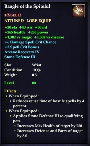 Bangle of the Spiteful 76,461 pages on this wiki Edit Edit source History Talk 0 In-Game Examine Window Bangle of the Spiteful other resources EQ2U · LootDB · EQ2LL · ZAM · Census xml Bangle of the Spiteful FABLED ATTUNEABLE LORE-EQUIP HEIRLOOM +40 wis +50 int +20 sta +1,302 vs noxious +1,302 vs arcane 6% Crit Chance 3% Crit Bonus Arcane Recovery IV Stone Defense III Slot Wrist Level 80 ( Tier 9 ) Effects: When Equipped: Reduces reuse time of hostile spells by 4 percent. When Equipped: Applies Stone Defense III to qualifying pets. Increases Max Health of target by 750 Increases Defense and Parry of target by 8.0