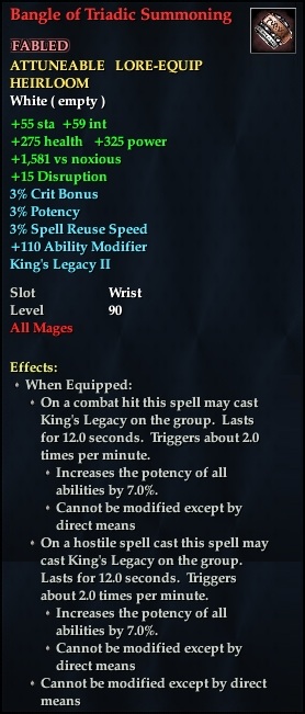 Bangle of Triadic Summoning 76,461 pages on this wiki Edit Edit source History Talk 0 In-Game Examine Window Bangle of Triadic Summoning other resources EQ2U · LootDB · EQ2LL · ZAM · Census xml Bangle of Triadic Summoning FABLED ATTUNEABLE LORE-EQUIP HEIRLOOM +59 int +55 sta +1,581 vs noxious +15 Disruption 3% Crit Bonus 3% Potency 3% Spell Reuse Speed +110 Ability Modifier King's Legacy II Slot Wrist Level 90 ( Tier 10 ) All Mages Effects: When Equipped: On a hostile spell cast this spell may cast King's Legacy on the group. Lasts for 12.0 seconds. Triggers about 2.0 times per minute. Increases Potency of group members by 7.0% Cannot be modified except by direct means On a combat hit this spell may cast King's Legacy on the group. Lasts for 12.0 seconds. Triggers about 2.0 times per minute. Increases Potency of group members by 7.0% Cannot be modified except by direct means Cannot be modified except by direct means