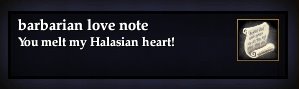 Barbarian love note 76,461 pages on this wiki Edit Edit source History Talk 0 In-Game Examine Window Barbarian love note other resources EQ2U · LootDB · EQ2LL · ZAM · Census xml EverQuest II Item Information Type : Love Note Barbarian love note You melt my Halasian heart! Obtain: Random drop off Barbarians during the Erollisi Day live event. Obtained by Exchanging Erollisi Day Hard Candies to Heartgar MacInnes in either Freeport or Qeynos What does this information mean? Categories : Items Love Note (Item Type) Articles missing itemlink Item pages with existing default images Add category Cancel Save