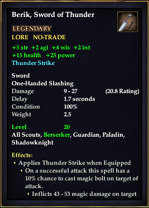 Berik, Sword of Thunder 76,463 pages on this wiki Edit Edit source History Talk 8 In-Game Examine Window Berik, Sword of Thunder other resources EQ2U · LootDB · EQ2LL · ZAM · Census xml Berik, Sword of Thunder LEGENDARY LORE NO-TRADE +5 str +2 agi +4 wis +2 int Thunder Strike Sword One-Handed Slashing Damage 8 - 25 (20.0 Rating) Delay 1.7 seconds Level 20 ( Tier 3 ) All Scouts , Berserker , Guardian , Paladin , Shadowknight Effects: When Equipped: On any combat or spell hit this spell may cast magic bolt on target of attack. Triggers about 2.4 times per minute. Inflicts 94 - 114 magic damage on target Cannot be modified except by direct means