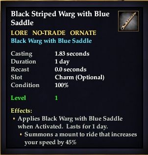 Black Striped Warg with Blue Saddle 76,461 pages on this wiki Edit Edit source History Talk 0 In-Game Examine Window Black Striped Warg with Blue Saddle other resources EQ2U · LootDB · EQ2LL · ZAM · Census xml Black Striped Warg with Blue Saddle LORE NO-TRADE ORNATE Black Warg with Blue Saddle Slot Charm (Optional) Level 1 ( Tier 1 ) Effects: Applies Black Warg with Blue Saddle when Activated. Lasts for 1 day. Summons a mount to ride that increases your speed by 130%