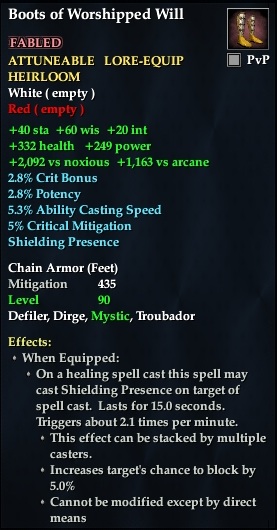 Boots of Worshipped Will 76,461 pages on this wiki Edit Edit source History Talk 0 In-Game Examine Window Boots of Worshipped Will other resources EQ2U · LootDB · EQ2LL · ZAM · Census xml Boots of Worshipped Will FABLED ATTUNABLE LORE-EQUIP HEIRLOOM +60 wis +20 int +40 sta +2,092 vs noxious +1,163 vs arcane 2.8% Crit Bonus 2.8% Potency 5.3% Ability Casting Speed Shielding Presence Chain Armor ( Feet ) Mitigation 435 Level 90 ( Tier 10 ) Defiler , Mystic , Dirge , Troubador Effects: When Equipped: On a healing spell cast this spell may cast Shielding Presence on target of spell cast. Lasts for 15 seconds. Triggers about 1.8 times per minute. Increases target's chance to block by 5.0 % This effect can be stacked by multiple casters. Cannot be modified except by direct means