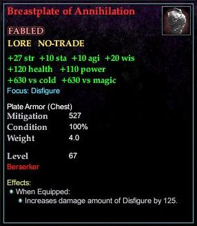 Breastplate of Annihilation 76,461 pages on this wiki Edit Edit source History Talk 0 In-Game Examine Window Breastplate of Annihilation other resources EQ2U · LootDB · EQ2LL · ZAM · Census xml Breastplate of Annihilation FABLED LORE NO-TRADE +27 str +10 agi +20 wis +10 sta +630 vs elemental +630 vs arcane Focus: Disfigure Plate Armor ( Chest ) Mitigation 527 Level 67 ( Tier 7 ) Berserker Effects: When Equipped: Increases damage amount of Disfigure by 125
