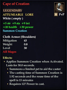 Cape of Creation 76,461 pages on this wiki Edit Edit source History Talk 0 In-Game Examine Window Cape of Creation other resources EQ2U · LootDB · EQ2LL · ZAM · Census xml Cape of Creation LEGENDARY ATTUNEABLE LORE +5 str +9 int +9 sta Summon Creation Cloth Armor ( Shoulders ) Mitigation 63 Level 30 ( Tier 4 ) All Mages Effects: Apples Summon Creation when Activated. Lasts for 30.0 seconds. Summons a limited pet to aid caster The casting time of Summon Creation is 2.0 seconds and the reuse time of the spell is 14 minutes 43 seconds Requires 127 Power to cast
