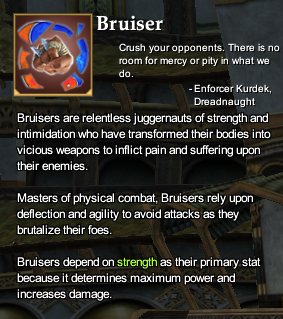 The Bruiser profession is ideal for those who want to pummel their enemies hand-to-hand. The Bruiser is a juggernaut of physical pain, having transformed their body into a vicious tool for inflicting suffering on their foes. The honing of the Bruiser's physical body conveys offensive as well as defensive advantages. The Bruiser is most effective on the front lines of combat.