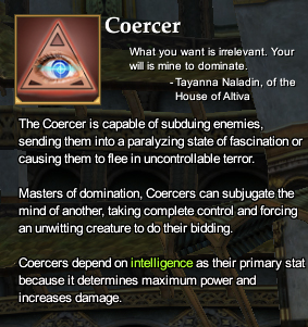 From the EverQuest II manual: Those who seek to dominate their foes, subjugating an enemy’s will to their own, will find the Coercer to their liking. The Coercer serves a party best behind the front lines. They can subdue multiple opponents, send enemies fleeing in induced unbridled terror, and even seize control of minds. A Coercer can also mentally augment their allies, improving their abilities in combat. The Coercer wears cloth armor and can use staves, wands, and daggers as weapons.