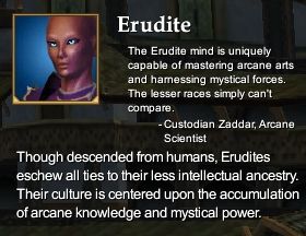 Though descended from normal Humans, Erudites eschew all ties to their less intellectual ancestry. Disciples of the great mage Erud, they long ago left the shores of Antonica and headed west to the barren coast of Odus. It was here that the city of Erudin was founded as a bastion of intelligence and culture. With high towers built of white marble, Erudin possesses a lofty beauty unsurpassed by any other work of man. Some years after the founding of the City of High Men, a sect of Erudites began practicing the art of necromancy after obtaining the knowledge from the dark elves. Labeled Heretics, these outcasts rebelled against their own people, and a terrible civil war broke out upon Odus. Magical forces took a horrible toll on all involved, and in a final epic battle a great hole was torn into the ground that touched the fringe of the Underfoot itself. Erudites consider all other races to be inferior, and have no qualms about saying so - especially regarding the kerra, who the Erudites see as little more than animals.