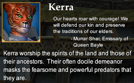 The Kerra are a humanoid feline race, slightly taller than humans, having muscular bodies that are covered in fur. Their fur comes in a wide variety of markings resembling that of tigers, lions, cheetahs, jaguars, snow leopards, ocelots, and other cats. The markings are said to denote the tribe to which each kerra belongs. They also have long tails that appear to be slightly prehensile. They are a docile people but can be fearsome when threatened. Kerra traditionally live in peaceful hunter-gatherer tribes but some live as solitary nomads. They are also agile, stealthy hunters. The Kerra language contains many low rolling R's, which can even be heard when conversing in Common, as Kerra tend to "purr" out the R's and vowels.