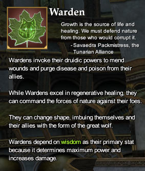 The Warden profession is ideal for those who desire to use harmonious magic provided by nature to fulfill a protective role in the world. The Warden serves their party by invoking their druidic powers to mend wounds and purge the effects of disease and poison that afflict their allies. The Warden may also invoke powers to bestow temporary protective effects on and enhance the attributes of their allies, as well as hinder or harm their foes.