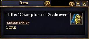 Champion of Drednever is a suffix title received from completing the quest Host of Thyr: Act III: Reckoning which is received from Ognit Eznertob in Solusek's Eye after you have completed Host of Thyr. Act II: Corruption .