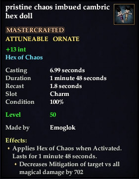 Chaos imbued cambric hex doll 76,461 pages on this wiki Edit Edit source History Talk 0 In-Game Examine Window Chaos imbued cambric hex doll other resources EQ2U · LootDB · EQ2LL · ZAM · Census xml Chaos imbued cambric hex doll MASTERCRAFTED ATTUNEABLE +13 int Hex of Chaos Slot Charm Level 50 ( Tier 6 ) Effects: Applies Hex of Chaos when activated. Lasts for 1 minute and 48 seconds. Decreases mitigation of target vs all magical damage by 702