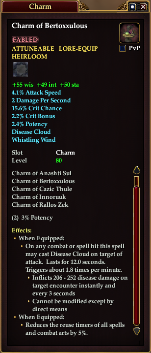 Charm of Bertoxxulous 76,461 pages on this wiki Edit Edit source History Talk 0 In-Game Examine Window Charm of Bertoxxulous other resources EQ2U · LootDB · EQ2LL · ZAM · Census xml Charm of Bertoxxulous FABLED ATTUNEABLE LORE-EQUIP HEIRLOOM +55 wis +49 int +50 sta 4.1% Attack Speed 2 Damage Per Second 15.6% Crit Chance 2.2% Crit Bonus 2.4% Potency Disease Cloud Whistling Wind Slot Charm Level 80 ( Tier 9 ) Effects: When Equipped: On any combat or spell hit this spell may cast Disease Cloud on target of attack. Lasts for 12.0 seconds. Triggers about 1.8 times per minute. Inflicts 206 - 252 disease damage on target encounter instantly and every 3 seconds Cannot be modified except by direct means When Equipped: Reduces the reuse timers of all spells and combat arts by 5%.