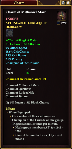Charm of Mithaniel Marr 76,461 pages on this wiki Edit Edit source History Talk 0 In-Game Examine Window Charm of Mithaniel Marr other resources EQ2U · LootDB · EQ2LL · ZAM · Census xml Charm of Mithaniel Marr FABLED ATTUNEABLE LORE-EQUIP HEIRLOOM +52 str +54 agi +53 sta +3 Defense +3 Deflection 9% Attack Speed 15.6% Crit Chance 2.7% Crit Bonus 2.9% Potency Champion of the Crusade Charges Unlimited Slot Charm Level 80 ( Tier 9 ) Effects: When Equipped: On a melee hit this spell may cast Champion of the Crusade on the group. Triggers about 1.8 times per minute. Heals group members (AE) for 1142 - 1396 Cannot be modified except by direct means