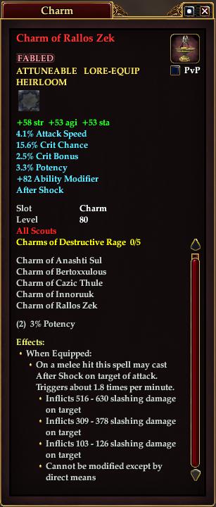 Charm of Rallos Zek 76,461 pages on this wiki Edit Edit source History Talk 0 In-Game Examine Window Charm of Rallos Zek other resources EQ2U · LootDB · EQ2LL · ZAM · Census xml Charm of Rallos Zek FABLED ATTUNEABLE LORE-EQUIP HEIRLOOM +58 str +53 agi +53 sta 4.1% Attack Speed 15.6% Crit Chance 2.5% Crit Bonus 3.3% Potency +82 Ability Modifier After Shock Slot Charm Level 80 ( Tier 9 ) All Scouts Effects: When Equipped: On a melee hit this spell may cast After Shock on target of attack. Triggers about 1.8 times per minute. Inflicts 516 - 630 slashing damage on target Inflicts 309 - 378 slashing damage on target Inflicts 103 - 126 slashing damage on target Cannot be modified except by direct means