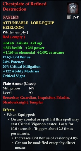 Chestplate of Refined Destruction 76,461 pages on this wiki Edit Edit source History Talk 0 In-Game Examine Window Chestplate of Refined Destruction other resources EQ2U · LootDB · EQ2LL · ZAM · Census xml Chestplate of Refined Destruction FABLED ATTUNABLE LORE-EQUIP HEIRLOOM +64 str +21 agi +43 sta +1,163 vs elemental +2,092 vs arcane 12.6% Crit Bonus 2.8% Potency +122 Ability Modifier Critical Vigor Plate Armor ( Chest ) Mitigation 679 Level 90 ( Tier 10 ) Inquisitor , Templar , Paladin , Shadowknight , Berserker , Guardian Effects: When Equipped: On any combat or spell hit this spell may cast Critical Vigor on caster. Lasts for 10.0 seconds. This effect will trigger an average of 2.0 times per minute. Increases Crit Bonus of caster by 3.0 % Cannot be modified except by direct means