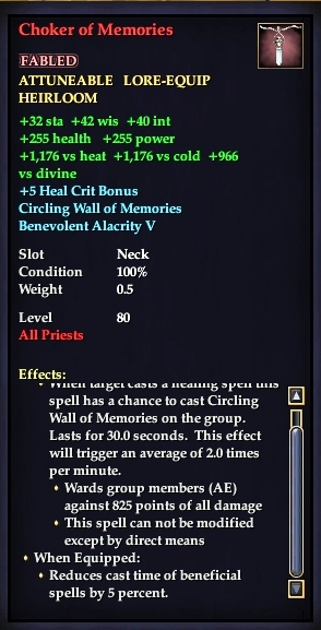 When target casts a healing spell this spell has a chance to cast Circling Wall of Memories on the group. Lasts for 30.0 seconds. This effect will trigger an average of 2.2 times per minute.
