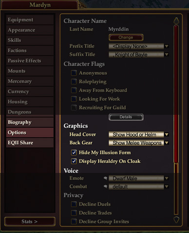 - Locate the checkbox labeled Display Heraldry on Cloak and check it to show the guild cloak. (Uncheck it to hide heraldry)