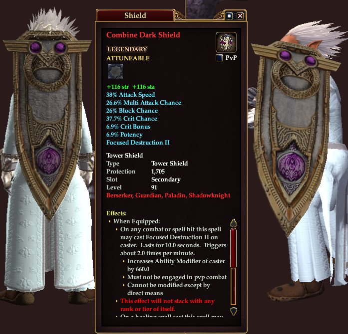 Combine Dark Shield 76,461 pages on this wiki Edit Edit source History Talk 0 In-Game Examine Window Combine Dark Shield other resources EQ2U · LootDB · EQ2LL · ZAM · Census xml Combine Dark Shield LEGENDARY ATTUNEABLE +116 str +116 sta 38% Attack Speed 26.6% Multi Attack Chance 26% Block Chance 37.7% Crit Chance 6.9% Crit Bonus 6.9% Potency Focused Destruction II Tower Shield Type Tower Shield Protection 1,705 Slot Secondary Level 91 ( Tier 10 ) Berserker , Guardian , Paladin , Shadowknight Effects: When Equipped: On a healing spell cast this spell may cast Focused Destruction II on caster. Lasts for 10.0 seconds. Triggers about 2.0 times per minute. Increases Potency of caster by [ information needed ] % Increases Crit Bonus of caster by [ information needed ] % Increases Ability Modifier of caster by [ information needed ] Must not be engaged in pvp combat Cannot be modified except by direct means This effect will not stack with any rank or tier of itself. On any combat or spell hit this spell may cast Focused Destruction II on caster. Lasts for 10.0 seconds. Triggers about 2.0 times per minute. Increases Potency of caster by [ information needed ] % Increases Crit Bonus of caster by [ information needed ] % Increases Ability Modifier of caster by [ information needed ] Must not be engaged in pvp combat Cannot be modified except by direct means You may only benefit from one effect of this type. Cannot be modified except by direct means