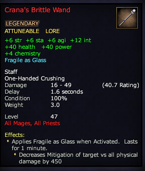 Crana's Brittle Wand 76,461 pages on this wiki Edit Edit source History Talk 0 In-Game Examine Window Crana's Brittle Wand other resources EQ2U · LootDB · EQ2LL · ZAM · Census xml Crana's Brittle Wand LEGENDARY ATTUNEABLE LORE +6 str +6 agi +12 int +6 sta +4 Chemistry Fragile as Glass Staff One-Handed Crushing Damage 16 - 49 (40.7 Rating) Delay 1.6 seconds Level 47 ( Tier 5 ) All Mages , All Priests Effects: Applies Fragile as Glass when Activated, for 1 minute: Decreases Mitigation of target vs all physical damage by 450