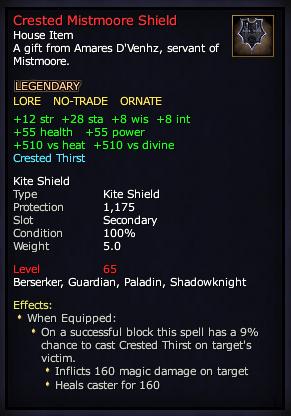 Crested Mistmoore Shield 76,463 pages on this wiki Edit Edit source History Talk 0 In-Game Examine Window Crested Mistmoore Shield other resources EQ2U · LootDB · EQ2LL · ZAM · Census xml Crested Mistmoore Shield House Item A gift from Amares D'Venhz, servant of Mistmoore LEGENDARY LORE NO-TRADE +38 str +38 sta 7 Damage Per Second 23% Block Chance 11.4% Crit Chance 2.4% Crit Bonus 2.4% Potency +23 Ability Modifier Crested Thirst Kite Shield Type Kite Shield Protection 1257 Slot Secondary Level 65 ( Tier 7 ) Berserker , Guardian , Paladin , Shadowknight Effects: When Equipped: On a successful block this spell has a 12% chance to cast Crested Thirst on targets victim. Inflicts 160 magic damage on target Heals caster for 160