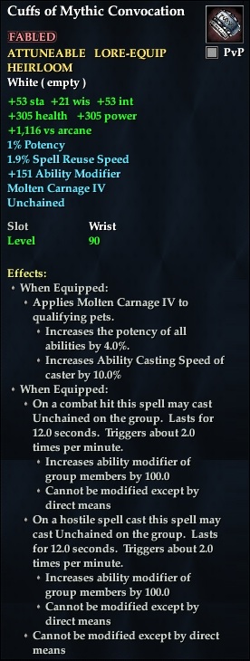 Cuffs of Mythic Convocation 76,461 pages on this wiki Edit Edit source History Talk 0 In-Game Examine Window Cuffs of Mythic Convocation other resources EQ2U · LootDB · EQ2LL · ZAM · Census xml Cuffs of Mythic Convocation FABLED ATTUNEABLE LORE-EQUIP HEIRLOOM +21 wis +53 int +53 sta +1,116 vs arcane 1% Potency 1.9% Spell Reuse Speed +151 Ability Modifier Molten Carnage IV Unchained Slot Wrist Level 90 ( Tier 10 ) Effects: When Equipped: Applies Molten Carnage IV to qualifying pets. Increases the potency of all abilities by 4.0%. Increases Ability Casting Speed of caster by 10.0% When Equipped: On a hostile spell cast this spell may cast Unchained on the group. Lasts for 12.0 seconds. Triggers about 2.0 times per minute. Increases ability modifier of group members by 100.0 Cannot be modified except by direct means On a combat hit this spell may cast Unchained on the group. Lasts for 12.0 seconds. Triggers about 2.0 times per minute. Increases ability modifier of group members by 100.0 Cannot be modified except by direct means Cannot be modified except by direct means