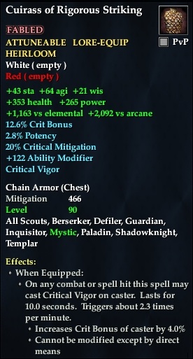 Cuirass of Rigorous Striking 76,461 pages on this wiki Edit Edit source History Talk 0 In-Game Examine Window Cuirass of Rigorous Striking other resources EQ2U · LootDB · EQ2LL · ZAM · Census xml Cuirass of Rigorous Striking FABLED ATTUNABLE LORE-EQUIP HEIRLOOM +64 agi +21 wis +43 sta +1,163 vs elemental +2,092 vs arcane 12.6% Crit Bonus 2.8% Potency Critical Vigor Chain Armor ( Chest ) Mitigation 466 Level 90 ( Tier 10 ) All Scouts , Berserker , Guardian , Paladin , Shadowknight , Inquisitor , Templar , Defiler , Mystic Effects: When Equipped: On a combat hit this spell may cast Critical Vigor on caster. Lasts for 10.0 seconds. Trigers about 2.0 times per minute. Increases Crit Bonus of caster by 3.0% Cannot be modified except by direct means
